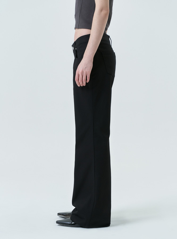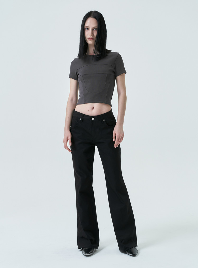 스트레이트-부츠컷 실루엣이 매력적인 미드-라이즈 진입니다.