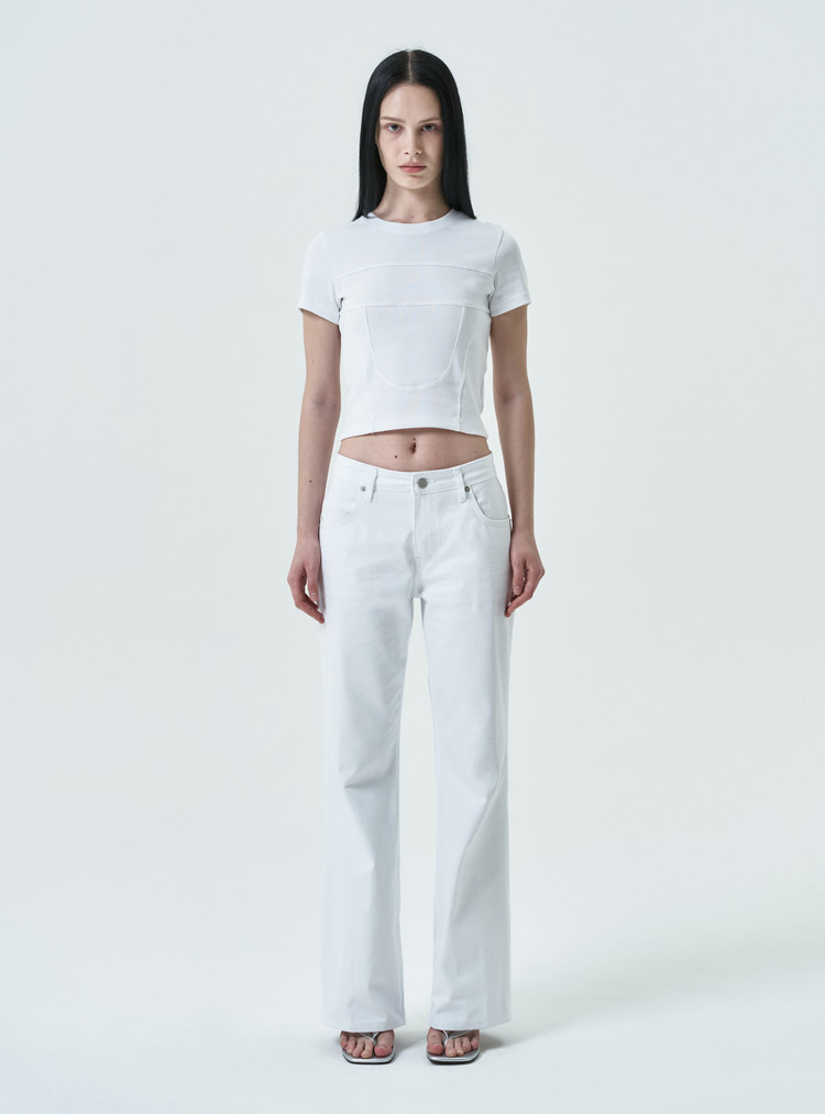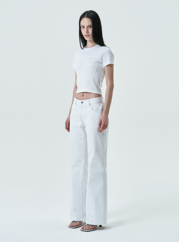스트레이트-부츠컷 실루엣이 매력적인 미드-라이즈 진입니다.